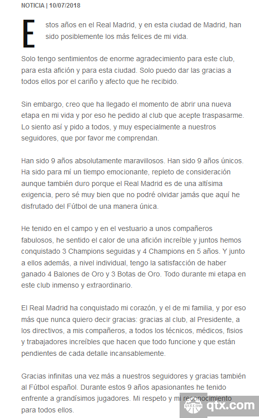 「在皇家馬德裡和馬德裡市的這九年時光可能是我一生中最快樂的時光。我對皇家馬德裡、對這座城市、對支持我的球迷們懷有深深地感激之情。對於我收到的喜愛和祝福,我只能表示感謝。但是,我相信是時候開啟人生中一段新的征程了,所以我希望皇馬同意我離開。我請求所有人,特別是球迷們理解我的決定。