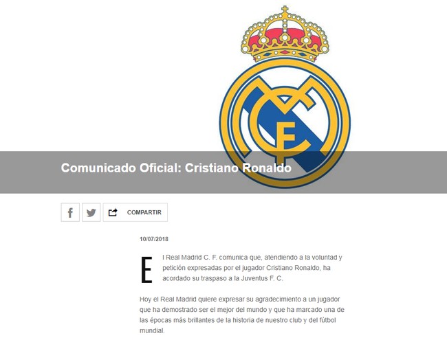 C羅對球隊和馬德里致上最真誠感謝,但他相信現在是進入人生的新階段,也是皇馬同意轉會的原因,希望皇馬的球迷能理解他的決定。