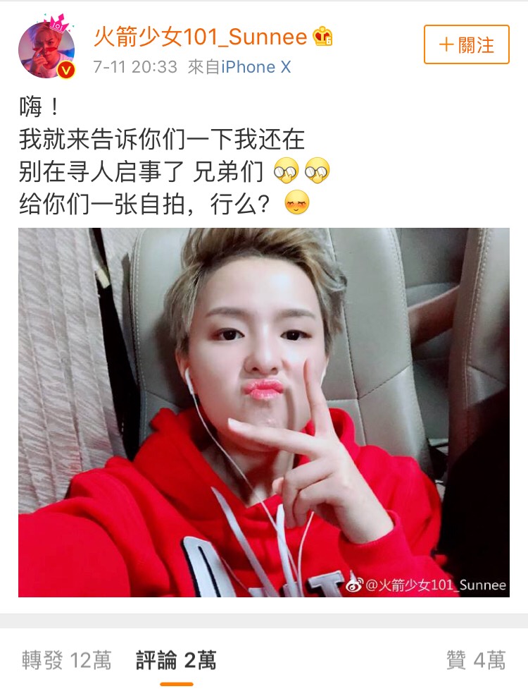 Sunnee發現粉絲廣發「尋人啟事」後,親自在微博上公開一張自拍照,照片裡她身穿紅色帽T,在下巴、臉頰旁俏皮比著ya的手勢,告訴大家:「嗨!我就來告訴你們一下,我還在,別再尋人啟事了,兄弟們,給你們一張自拍,行嗎?」