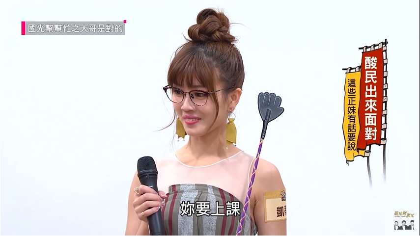 綜藝節目《國光幫幫忙》近日出了 一集「酸民出來面對!這些正妹有話要說! 」讓曾遭網友謾罵的正妹們能有機會正面回應酸民的攻擊,來賓中有一位辣妹英文老師「凱蒂」來分享因她的職業而遭受的酸言酸語,結果外貌姣好性感的她一出場便引起全場轟動,戴上眼鏡手拿教鞭的樣子太火辣,主持群紛紛拜倒在石榴裙下大呼「我想被她打」,網友們也留言直呼「老師太正了吧」、「我都想上英文課了」、「想被她打」