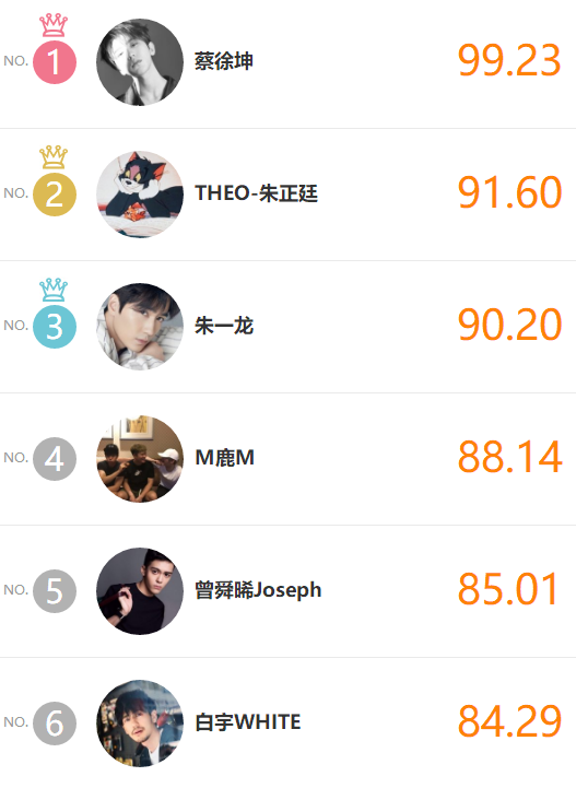 最新一期的榜單出爐,位居前六名的明星分別為蔡徐坤、朱正廷、朱一龍、鹿晗、曾舜晞、白宇。前兩名毫無疑問地由目前熱度最高的偶像男團NINE PERCENT(9%)的兩名成員奪下,特別值得一提的是名次大暴衝的超強黑馬朱一龍。