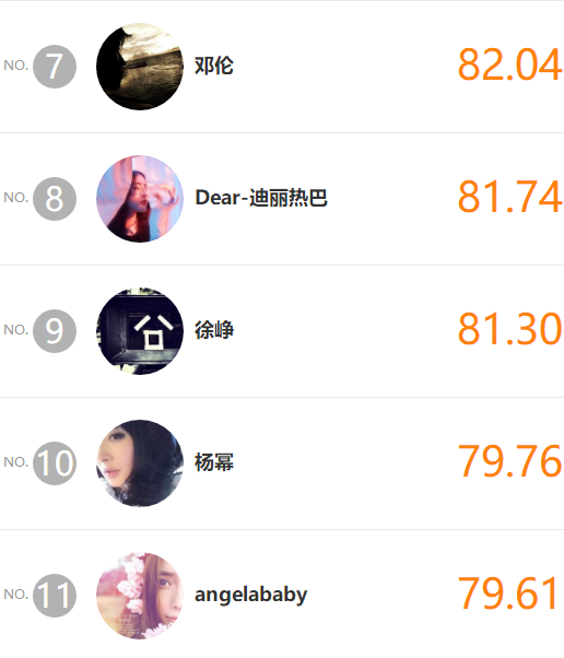 接下來的第7至11名分別為,鄧倫、迪麗熱巴、徐崢、楊冪、楊穎,排在第15至第19位的明星則是鞠婧禕、 黃子韜、胡一天、王俊凱、易烊千璽。其中,一直以來都是明星勢力榜的常勝冠軍,炙手可熱的男團TFBoys這次不但只有兩名成員上榜,更是幾乎墊底,非常免強的才爬上勢力榜。