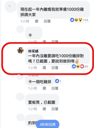 林采緹最近即將臨盆,如今老公卻爆出撿屍性侵他人,讓人不勝唏噓。而遭到提告之後,胡睿兒應訊時辯稱,雙方是兩情相悅,並非性侵,由於雙方各說各話,檢方還在調查中。而今有網友翻出當時網友狠酸兩人:「一年內離婚我就準備1000份雞排請大家」林采緹親回:「一年內沒離要請吃1000份雞排對嗎?已截圖,要說到做到喔。」胡睿兒更寫道:「如果我一年內離婚,我的Audi tt直接過戶給你」,現在看來兩人可能一語成讖。