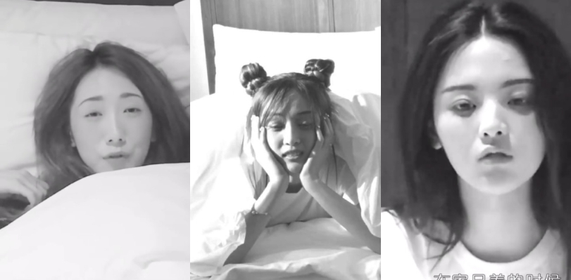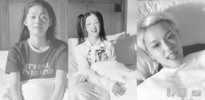 黑白色調的畫面中,可以看到孟美岐兩眼略微無神,一臉懵地盯著鏡頭,吳宣儀紮起兩個包包頭,少了眼妝的修飾,黑眼圈完全浮現,楊超越大致上沒有太大落差只是睡眼有些惺忪。
