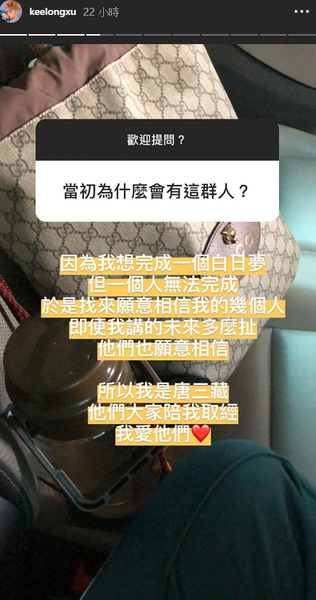 12日展榮在IG限時動態和大家互動,有粉絲提問:「當初為什麼會有這群人?」,展榮回答:「因為我想完成一個白日夢,但一個人無法完成,於是找來願意相信我的幾個人,即便我講的未來多麼扯,他們也願意相信」,「所以我是唐三藏,他們大家陪我取經,我愛他們」,對於「這群人對你來說是什麼」的問題,他也回答:「是貴重的物品」。