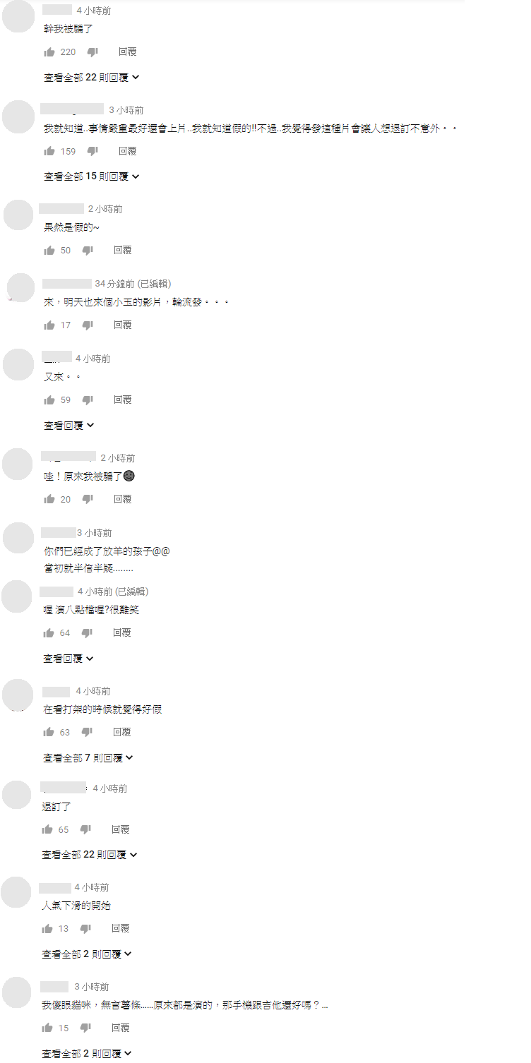前兩支影片都紛紛有網友質疑炒作,而真相大白之後,仍有許多網友表示被騙,紛紛留言:「我被騙了」、「我就知道,事情嚴重最好還會上片」、「果然是假的」、「原來我被騙了」、「你們已經成了放羊的孩子」「在看打架的時候就覺得好假」也引起退訂熱潮:「我覺得發這種片會讓人想退訂不意外」、「退訂了」。