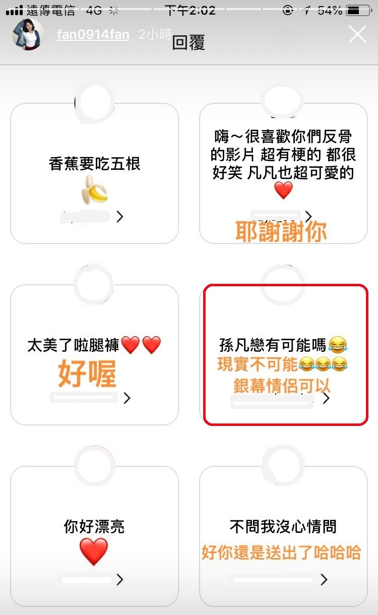 節目播出之後,便有許多網友期待是否有新CP誕生,紛紛敲碗「孫凡戀」。而三個月後,凡凡終於做出回應!13日凡凡透過IG限時動態和網友互動,面對網友詢問:「孫凡戀有可能嗎」的問題,凡凡打上笑臉親自回覆:「現實不可能,螢幕情侶可以」,打槍孫生。而對於其他粉絲打的內容凡凡也熱情一一回覆,超級親民。