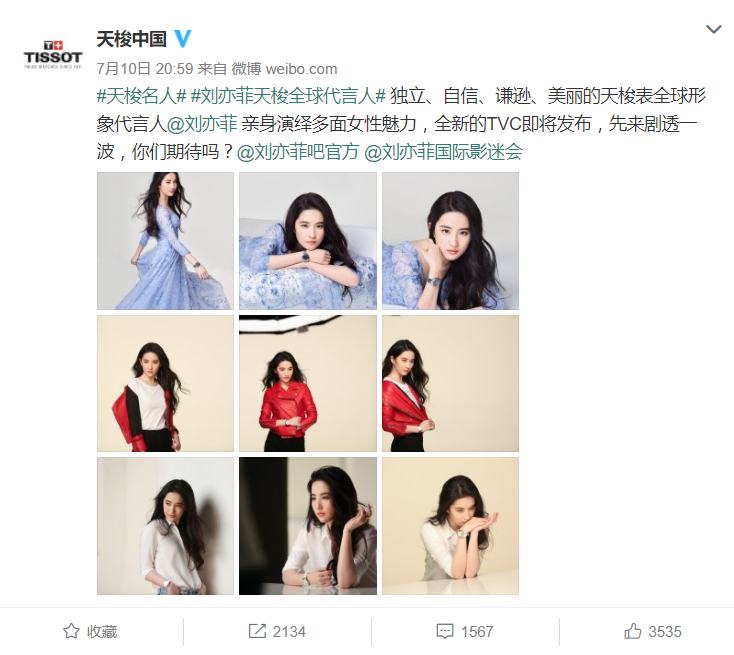 於10日時天梭中國TISSOT在微博劉亦菲一系列的照片,其中劉亦菲穿著淡藍色的裙子,薄紗透著光滑白皙的雙臂,臉上帶著自信而大方的神態,飄飄如仙女一般,而讓人吃驚的是,劉亦菲的胸前開了超深V,露出姣好的身材。而天梭中國還附上一段文:「獨立、自信、謙遜、美麗的天梭表全球形象代言人劉亦菲親身演繹多面女性魅力,全新的TVC即將發布,先來劇透一波,你們期待嗎?」美麗的代言人,手錶也形成了代言人散發氣質的一部份,也難怪有網友認為選擇劉亦菲為代言人,實在是明智的決定。