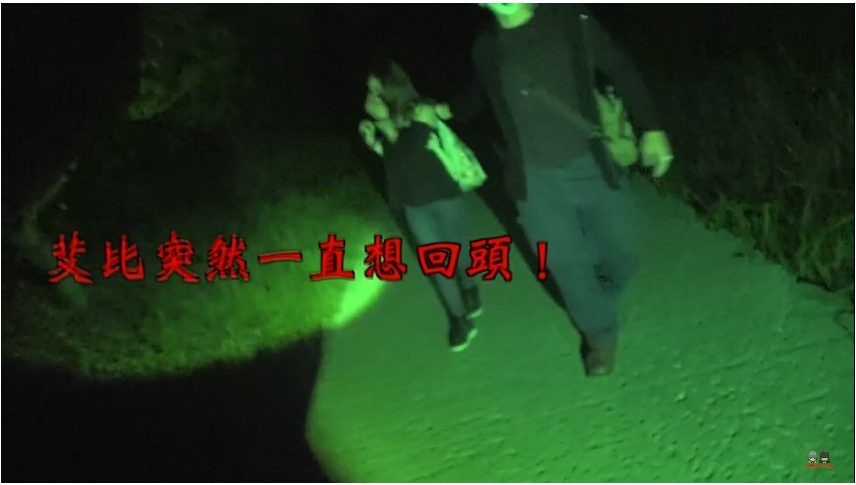 走到深處時「艾比」突然做出奇怪的行動,頻頻回頭往後看,還不斷的想脫隊,好在「鬼Man」及時發現,叫大家不要說話趕快走,才脫離危機,事後艾比表示自己頭很暈很不舒服,疑似有中邪的狀況,探險結束後「未來男友」也勸觀眾們白天來玩就好,晚上還是不要輕易踏足這個惡地。