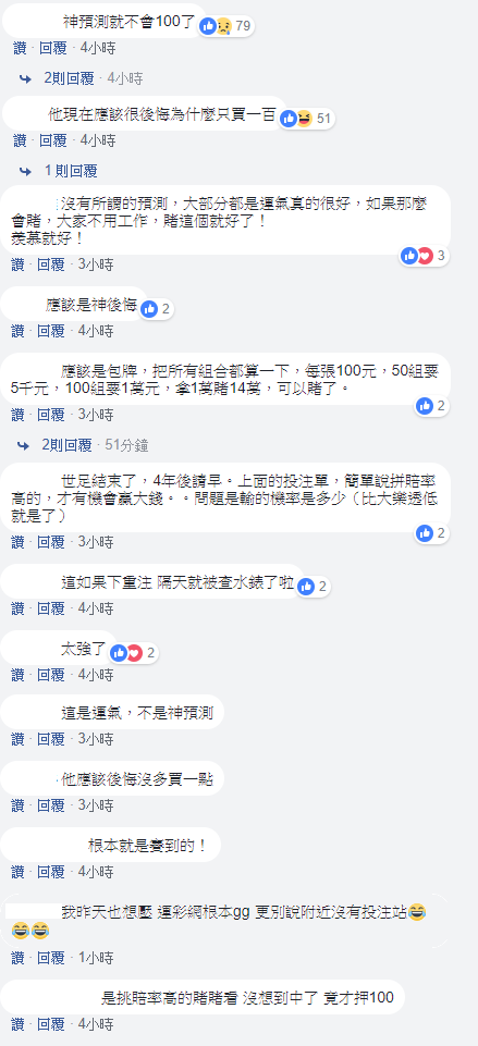 不過原PO友人僅僅投注100元,雖然最後有高達14萬3000元的彩金,也引起網友討論:「他現在應該很後悔為什麼只買一百」、「應該神後悔」、「神預測就不會100了」、「這是運氣,不是神預測」、「根本就是賽到的」、「他應該後悔沒多買一點」。