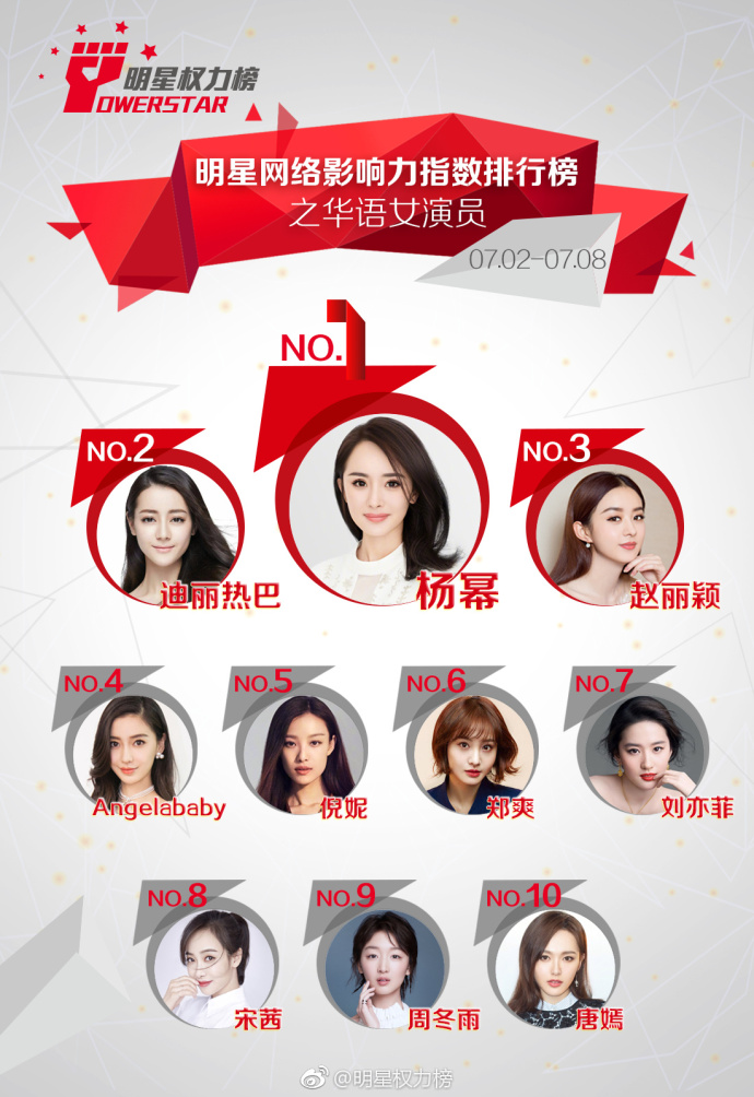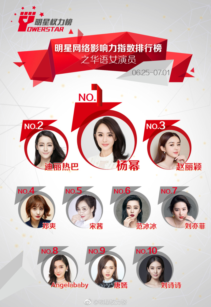 第一百六十五期榜單之華語女演員Top10: NO 1.楊冪 NO 2.迪麗熱巴 NO 3.趙麗穎 NO 4.鄭爽 NO 5.宋茜 NO 6.范冰冰 NO 7.劉亦菲 NO 8.Angelababy NO 9.唐嫣 NO 10.劉詩詩 ( 百度指數、媒體報道量第一:楊冪;微博熱議度、微博互動率第一:迪麗熱巴;貼吧活躍度第一:趙麗穎;貼吧簽到數第一:宋茜;微信指數第一:范冰冰 )