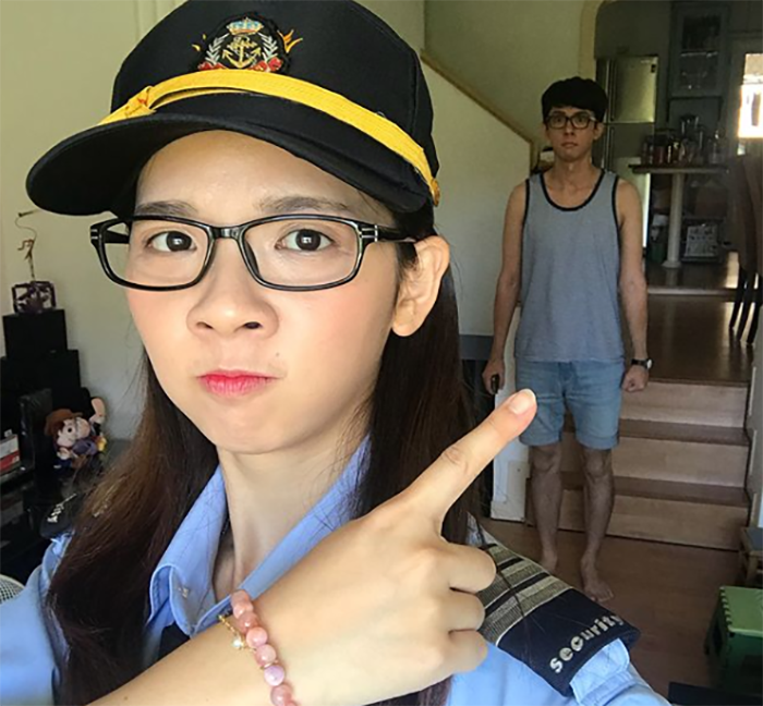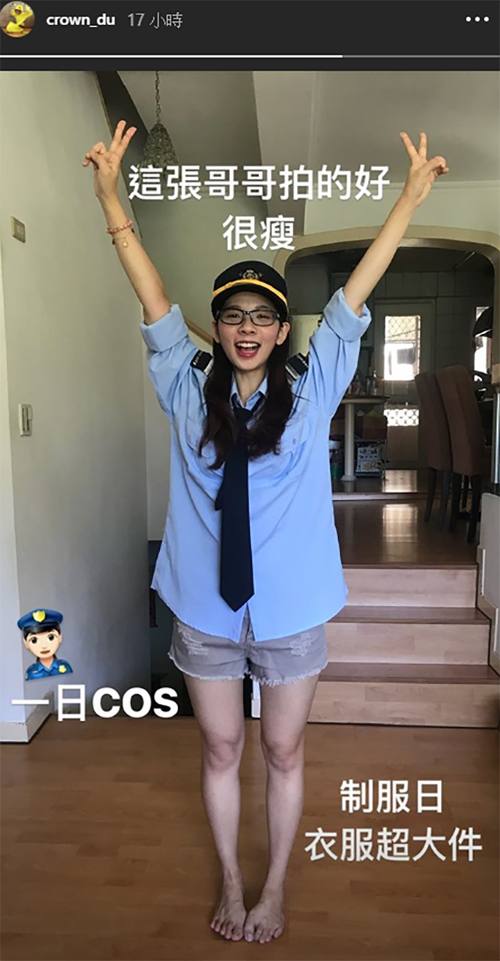 昨(17)日滴妹在IG限時動態放上自己cosplay女警的全身照片,並稱讚哥哥阿滴:「這張哥哥拍得很好,很瘦」,而她也發文放上與哥哥的合照,搞笑表示:「有制服怎麼能不cos一下呢?後面那位先生!我要逮捕你囉!」,只見她穿上大SIZE的警察制服,還戴上警帽,而阿滴在後方則十分僵硬,一副做錯事要被捕的模樣,兩人互動十分逗趣。