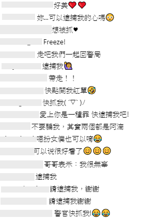 而滴妹性感又可愛的模樣也讓粉絲超級激動,紛紛留言:「請逮捕我謝謝」、「我想被滴妹逮捕」、「我跟你走」、「快點開我紅單」、「逮捕我,拜託」、「走吧我們一起回警局」、「我想被滴妹逮捕」、「愛上你是一種罪 快逮捕我吧!」、「快抓我」。