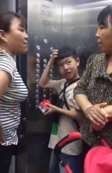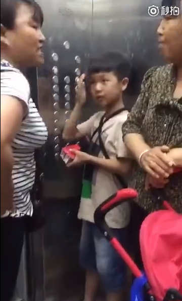 中國大媽的新聞層出不窮,在國外旅遊也常聽到中國大媽渾厚有力的聲音,在中國也常見到她們的特殊事蹟,像是自助餐搶食讓其他客人吃不到東西、或是特價商品激烈大搶購、又或是隨地便溺等等,近日又有一個影片在網路上被網友瘋傳,影片的場景在電梯中,兩個大媽不知道為了甚麼事情,瘋狂的互罵對方,眼神、語氣都相當兇狠,尤其是條紋上衣的大媽不斷重複同一個句子,原本看似嚴肅的氛圍也變得有點搞笑,除了兩個大媽激烈的對話內容之外,還有夾在兩人之間的小弟弟,抓著頭,看起來真的很無奈啊!