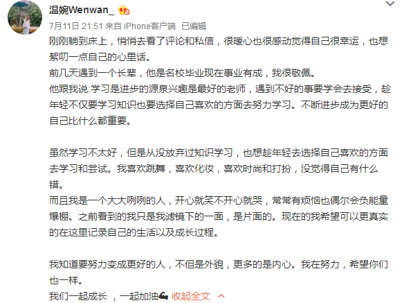 這不為了回饋一直願意追隨自己的鐵粉,前幾日溫婉還寫了一段深情流露心聲並與粉絲共勉。