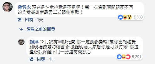 館長日前被自稱高雄南霸天的網友「魏雲永」公開挑釁。綽號陽陽的「魏雲永」不僅公然嗆館長,更大膽宣戰要求館長與他PK,館長也第一時間邀請對方12月時參加比賽,怎料僅隔兩日便發生變數。