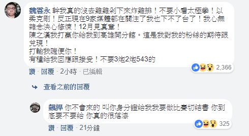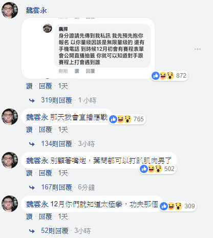魏雲永「陽陽」17日數度在臉書標記館長並撂下狠話,表示自己得到阿公太極拳真傳,非常囂張:「那天我會直播應戰」、「別顧著嘴炮」,「葉問都可以打趴肌肉男了」、「12月你們就知道太極拳,功夫那個」,更把自己臉書的封面換成自己和館長的「矛盾大對決」。
