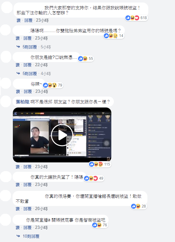 而他之前所有直播和館長嗆聲的畫面也被網友錄影存證,眼下卻胡扯自己被盜,也讓本來等待他跟館長PK的群眾大失所望,紛紛留言:「你朋友是誰?口說無憑」、「你雙胞胎弟弟盜用你的帳號是嗎」、「你真的太讓我失望了!陽陽」、「你真的很烙賽,你還開直播嗆館長還說被盜!敢做不敢當」、「你是智商被盜吧」,此外網友也貼上「館長vs.魏陽陽」下注畫面。而陽陽道歉之後,館長也放上之前陽陽的留言截圖,狠嗆對方。