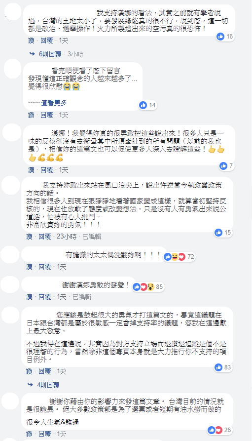 文章發布後,立刻引起廣大迴響,許多網友紛紛表態支持:「我是人,我支持以核養綠。」、「推漢娜勇敢發聲,支持以核養綠!」、「有膽識的太太偶洗翻妳啊!」、「漢娜真的很勇敢 好喜歡妳!」、「有知識又勇敢的網紅」、「辛苦了,可能會有一波不理性的人來留言吧,漢娜加油」。
