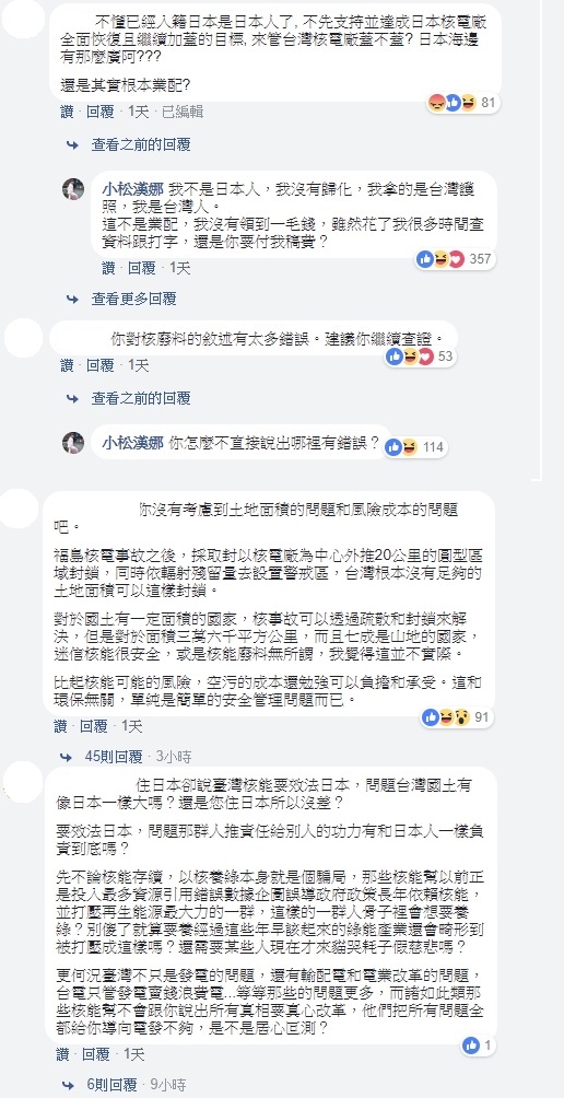 不過同時,也有許多不同立場的網友提出看法,認為漢娜沒有做全面的考量評估:「你沒有考慮到土地面積的問題和風險成本的問題」也詳細說明台灣和日本國土面積差異大,不能相提並論,更有網友認為小松漢娜的身分讓人覺得其沒有說服力:「不懂已經入籍日本是日本人了,來管台灣核電廠蓋不蓋」、「問題台灣國土有日本一樣大嗎?還是您住日本所以沒差?」