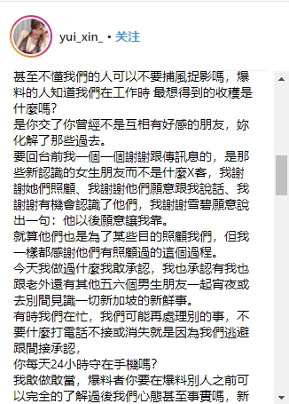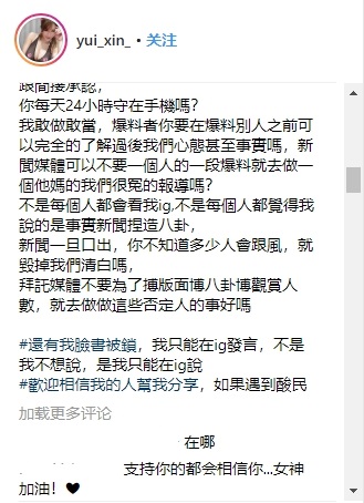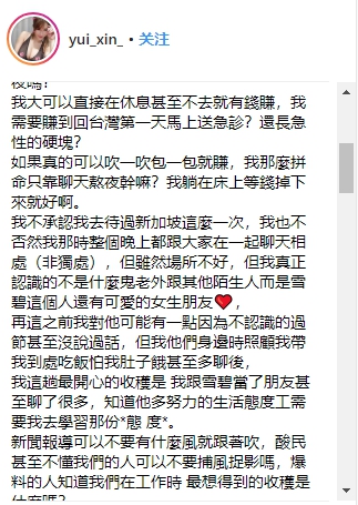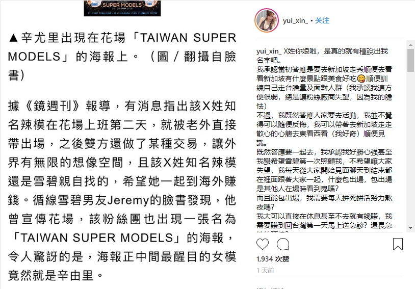 「辛尤里」遭媒體影射與「雪碧」一同前往新加坡酒店工作,期間還被老外帶出場,疑似有性交易,依照行情短短7天就可以賺到台幣45000元底薪。被影射賣淫的辛尤里發現自己的臉書被封鎖,於是在IG發了一篇長文痛訴真相。