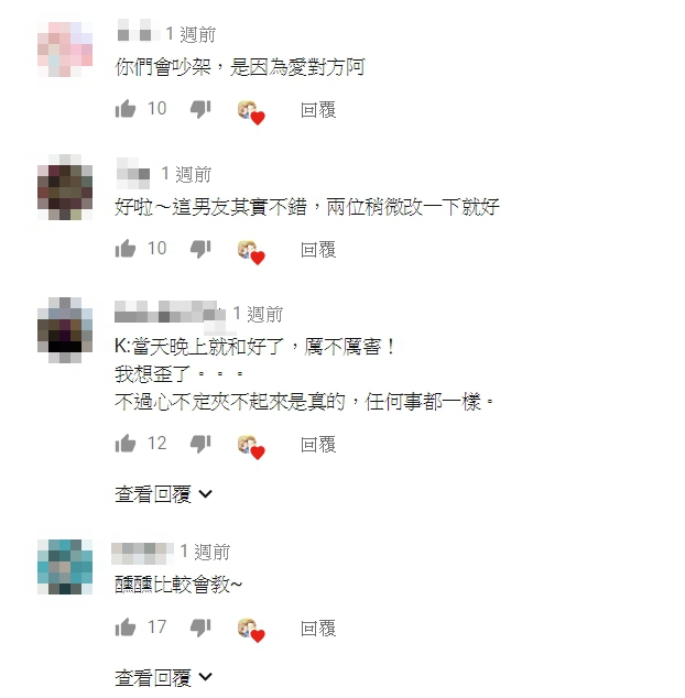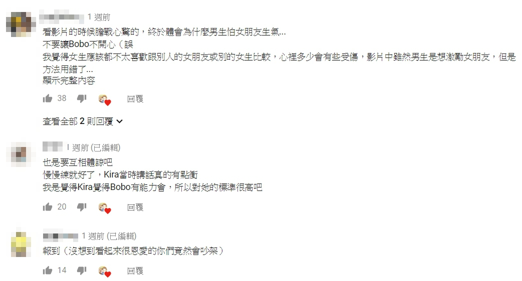 不少網友看到影片後,紛紛吐槽Kira並留言:「男生太囉唆,一直雜唸」、「Kira當時講話真的有點衝」、「雖然男生是想激勵女朋友,但是方法用錯了」,不過也有人趕緊緩頰:「會吵架,是因為愛對方啊」、「這男友其實不錯,兩位稍微改一下就好。」