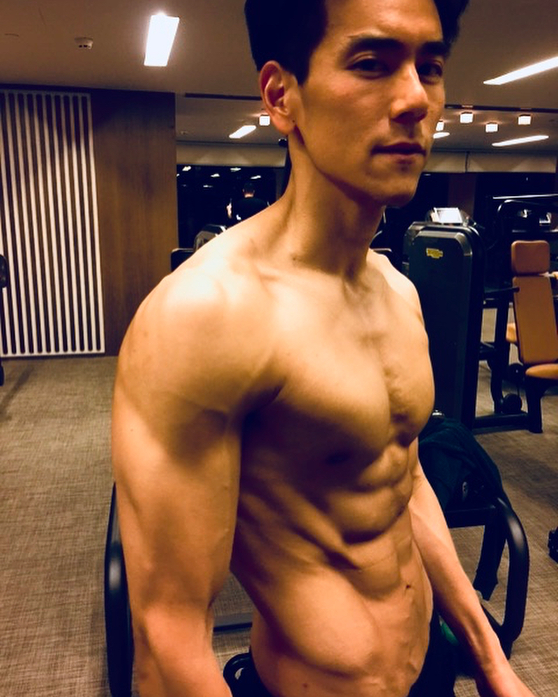 照片中可看見高高鼓起的胸肌、塊塊分明的八塊腹肌,手臂像大腿依樣粗壯,人稱「愛之把」的腹斜肌明顯的突起,上面都快要可以放一杯茶了,身材堪稱完美。
