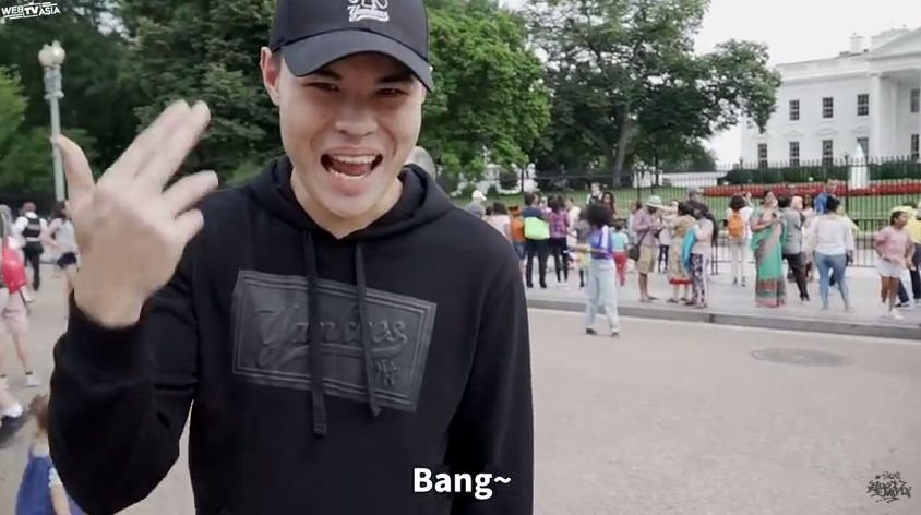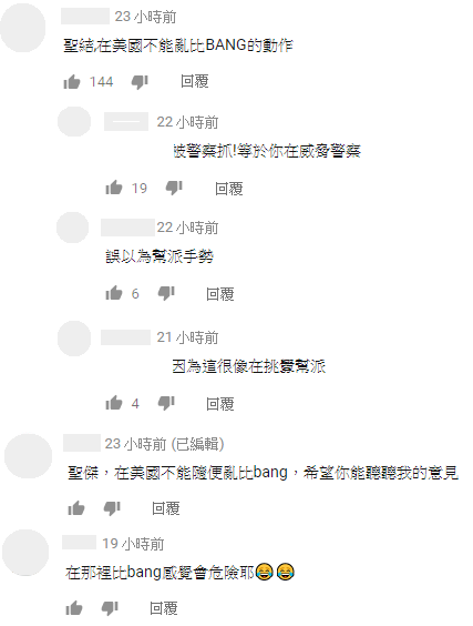 不過卻有網友發現,聖結石在美國仍然多次比出招牌手勢「bang」,甚至在白宮前與「假川普」合照完之後,也興奮比了「bang」,此舉也讓網友緊急提醒:「在美國不能亂比BANG的動作」、「會被警察抓!等於你在威脅警察」、「美國對槍很敏感,因為以前很多悲劇」、「希望你能聽聽我的意見」。