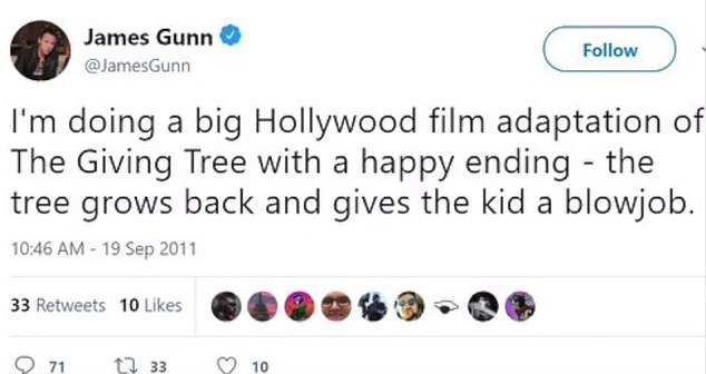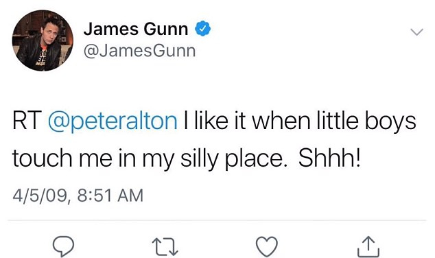 ▼原來網站 The Daily Caller 挖出了詹姆斯岡恩的昔日推特發言,發現他曾經數度拿戀童癖、強姦來開玩笑,像是「我喜歡當小男孩摸我重要部位」、「我正在改編《愛心樹》成為一部好萊塢大片,我會給故事一個快樂結局:樹長大之後,用口交報恩小男孩」,詹姆斯岡恩將兒童與性關係字眼做出大量連結,不當發言讓網友一片譁然。