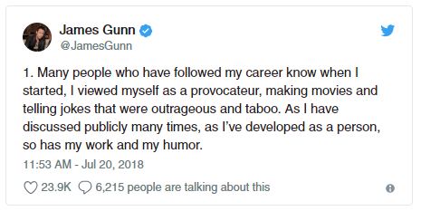 詹姆斯岡恩也在推特上為他昔日「不雅笑話」道歉,他表示:「近 10 年前,我當時的言論是完全失敗、不幸、麻木不仁的,不管時間過了多久,我理解並接受今天(迪士尼)做出的決定。即使是這麽多年以後,我依然要對我當時的言行負責。我現在所能做的,除了表達我真誠和衷心的歉意之外,就是盡我所能去做一個更好的人:接納、理解、致力於平等。對公開言論我有義務更加深思熟慮,對於我所在行業內外的每一個人,我再次向他們表示深深的歉意,愛所有的人。」