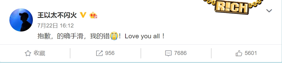 當這次點讚風波持續延燒前,王以太在昨日下午做出回應,他在微博上澄清道:「抱歉,的確手滑,我的錯!Love you all!」短短的幾句話向大家致歉,他表示手滑才會不小心點讚到那條微博,這樣下來這次風波算是暫時平息,況且《中國新說唱》還沒有播出到王以太加入吳亦凡戰隊的部分。
