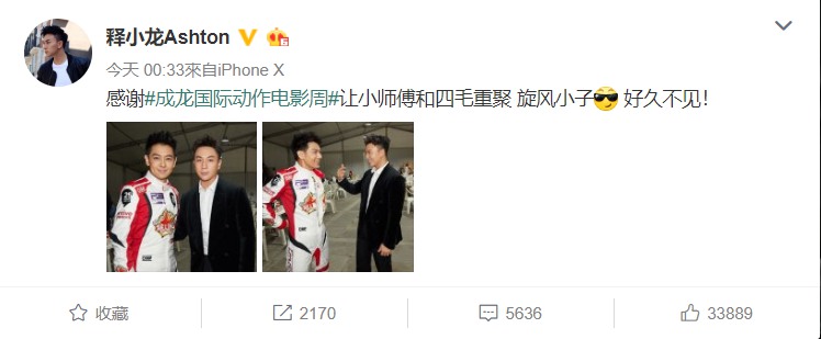 根據《ETtoday東森星光雲》的報導,釋小龍和林志穎過去曾一起合作電影《笑林小子》(又名《旋風小子》),時隔24年他們再次於「成龍國際動作電影週」相遇,一見面就是笑談近況和過去的回憶,當年的小帥哥長成大帥哥,當年的大帥哥還是大帥哥,即使2人相差13歲也是一點都看不出來,讓粉絲都忍不住感慨:「我已長大,你們還未變老。」