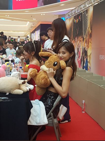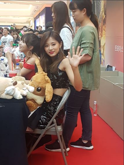 為宣傳新歌,TWICE在各地舉辦簽售會,22日在京畿道時,不意外的有超多粉絲前來應援。簽售會結束後,有粉絲在網路上公開成員們在現場的「0修圖」美照,其中,子瑜穿著黑色的細肩亮片短上衣,搭配黑色亮片開岔短裙,露出的螞蟻腰即使坐著也完全看不到任何贅肉,放在桌子上的手臂雖然纖細,卻仍可以看出微微的肌肉線條。