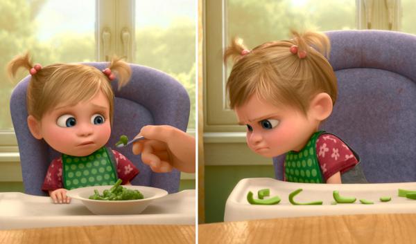 在動畫中台灣觀眾看見了美國原版,就是老爸要為女兒吃花椰菜時,她一臉嫌棄對這個蔬菜做出厭惡的表情。但皮克斯考慮到其他國家的小孩可能不討厭花椰菜,因此在日本版就將食物換成了右方的青椒。另外,原版動畫中爸爸在發呆時是想著曲棍球比賽,在其他國家也被換成了足球比賽。