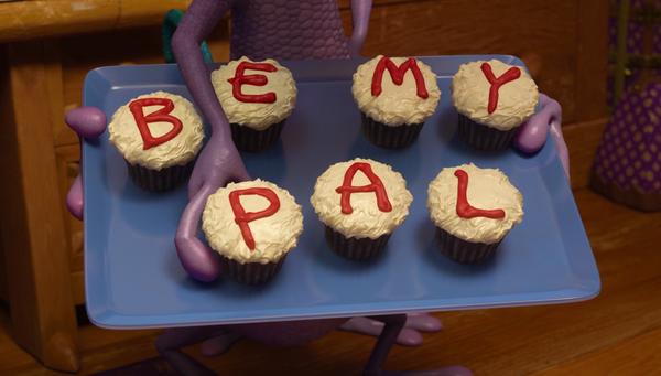 當藍道做了一些杯子蛋糕端過來,英文原版上面寫著:「BE MY PAL」,這個簡單的「做我的朋友吧」字眼卻很難精簡翻譯到其他國家的語言當中,因此皮克斯在其他國家版本中就將杯子蛋糕上面換成笑臉的圖案。