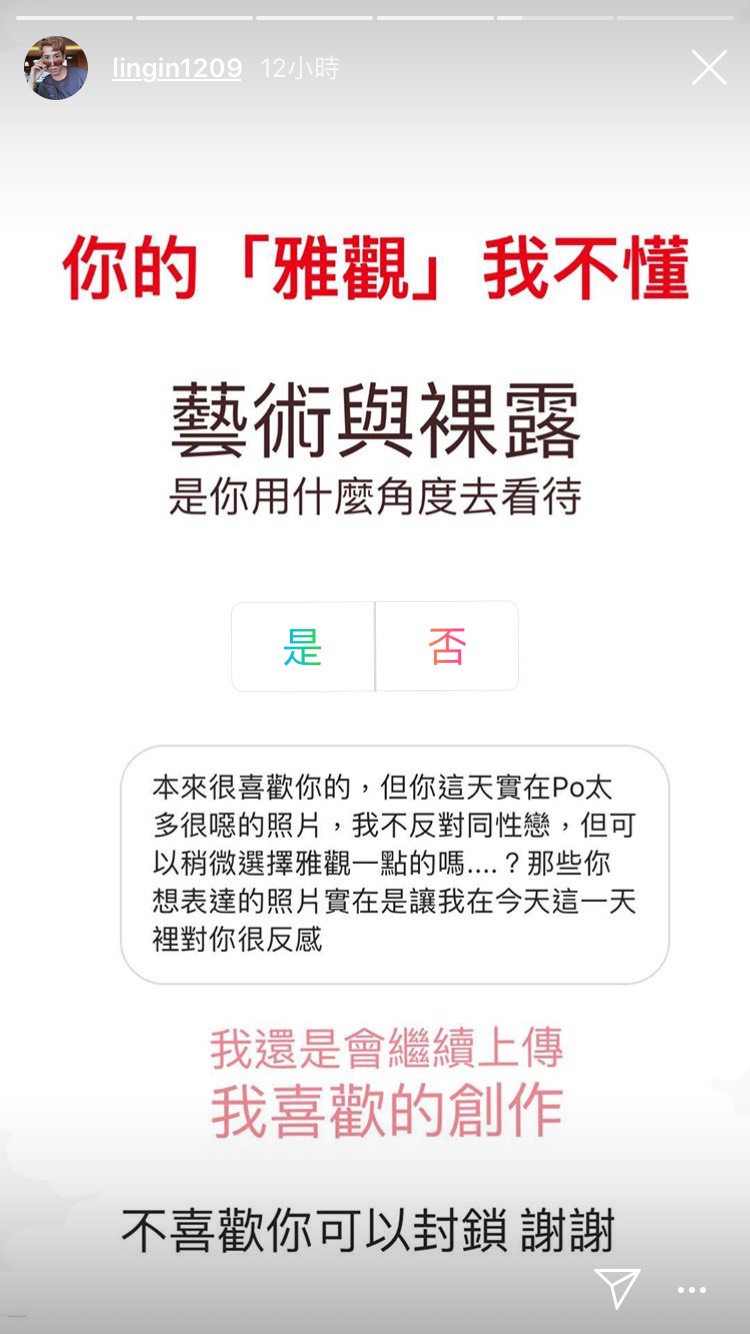 而兩人這組照片雖然受到很多網友大讚,卻也有網友私訊林進:「本來很喜歡你的,但你這天實在PO太多很噁的照片,我不反對同性戀,但你可以稍微選擇雅觀一點的嗎?那些你想表達的照片實在讓我對你很反感」,而林進也特地透過限時動態回覆:「你的『雅觀』我不懂,我還是會繼續上傳我喜歡的創作,不喜歡你可以封鎖」,事實上林進對於這組相片真的非常喜歡,不僅在留言處表示:「打破我對裸露的印象,很有質感,進軍國際哈哈哈」更大讚攝影師很厲害。