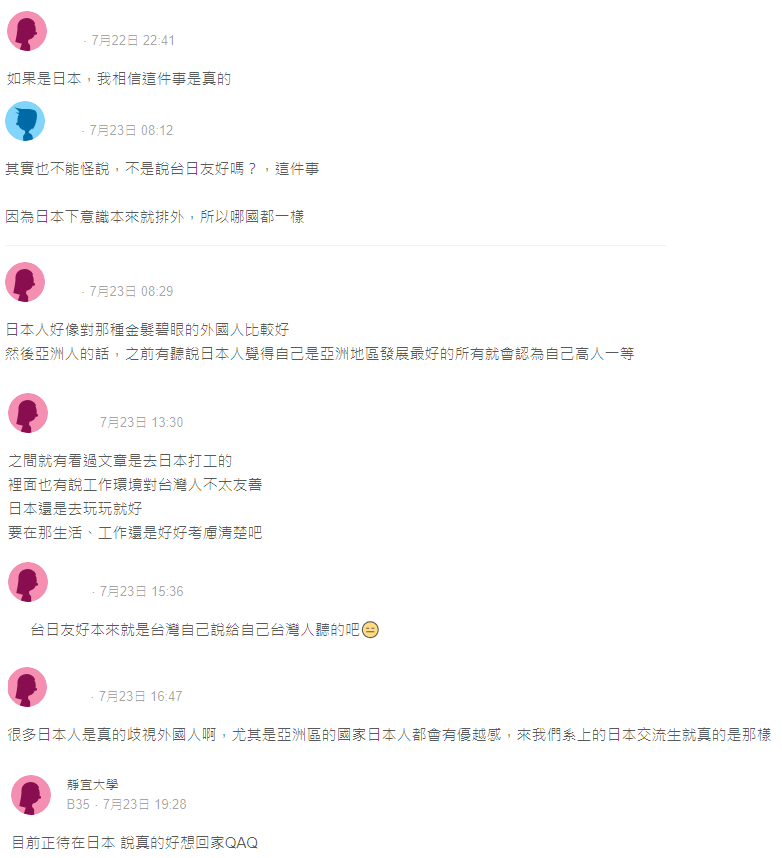 不過這件事也被網友放上dcard討論,引起部分網友共鳴:「如果是日本,我相信這件事是真的」、「因為日本下意識本來就排外,所以哪國都一樣」、「日本還是去玩玩就好,要在那生活、工作還是好好考慮清楚吧」、「目前正待在日本 說真的好想回家QAQ」。