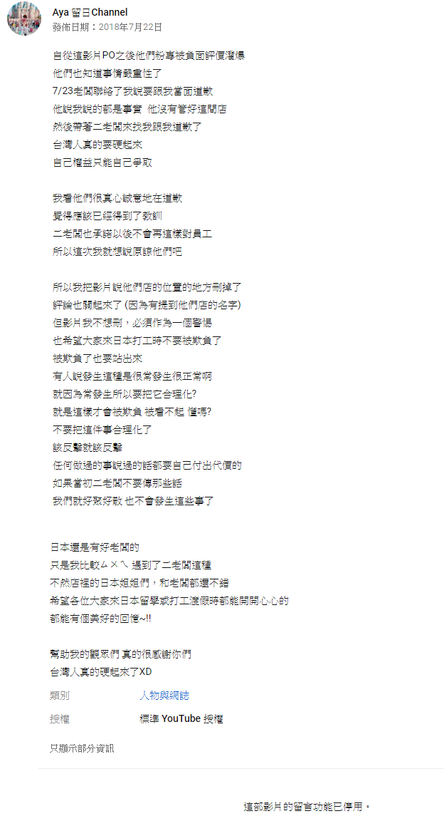 日本老闆的對待讓Aya覺得超級心寒,才決定拍攝影片放上網路,不過她最後也在資訊欄表示這部影片公布之後,網友自發性灌爆該店家的臉書,也讓對方驚覺事情的嚴重性,目前已經聯絡她要當面道歉,因為覺得店家得到教訓,她已將店家資訊撤掉,也關閉留言。同時她也呼籲粉絲:「台灣人真的要硬起來、自己權益只能自己爭取」。