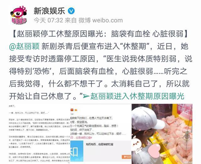 出道將近十幾年的趙麗穎,宣布在新劇殺青時停工調養身體,在她接受訪問時透露:自己的身體狀況很差,體質特別的弱,拍戲暫時太消耗自己的精神與體力,需要讓自己休息一下。大家或許知道趙麗穎曾經在拍戲時從馬身上摔下來,當時沒有立即就醫,造成骨頭錯位,留下了後遺症。後來拍攝花千骨時還特別在腰間別了花做掩飾,而拍戲這幾年她身體的傷也受了不少,看來這就是她停工最大的原因。