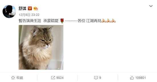 舒淇之前曾在深夜時發文說:“暫告演員生涯,承蒙錯愛......各位,江湖再見”,引發網友對於她要告別影壇的猜測,還好最後是虛驚一場,她只是暫休不是退休。至於她為何要暫退演藝圈,她自己說法是在演藝圈打滾20多年也該好好休息了,另一方面就是她有嚴重的過敏症,醫生告訴她需要良好的休息,為止身體變差。