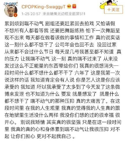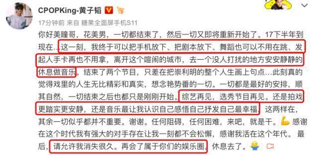 黃子韜就曾在微博淚訴自己在這個行業有多累,更把演藝圈的工作說的比地獄還不如,看來他肯定是負荷不了工作,因而選擇暫時離開演藝圈一陣子了。而6/24他更在微博說自己要放下一切東西好好去休息了,看得出來這段時間他不僅要休息同時也投入在做音樂當中,儘管黃子韜在演藝圈的評價壞多過於好,但由於真情流露,因此大家給的評價都是正面的。