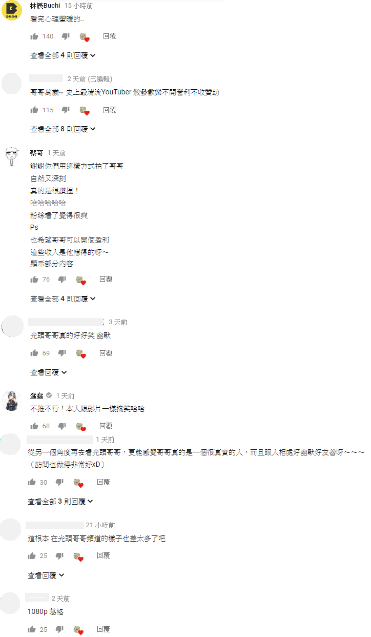這段影片上傳之後,讓許多網友對真實的光頭哥哥感到意外:「哥哥萬歲~ 史上最清流YouTuber 散發歡樂不開營利不收贊助」、「光頭哥哥真的好好笑 幽默」、「從另一個角度再去看光頭哥哥,更能感覺哥哥真的是一個很真實的人,而且跟人相處好幽默好友善呀」、「這根本 在光頭哥哥頻道的樣子也差太多了吧」。另外也有許多youtuber也做出回應,林辰就留言:「看完心裡蠻暖的」,蔡哥也表示:「謝謝你們用這樣方式拍了哥哥 自然又深刻 真的是很讚捏!」。