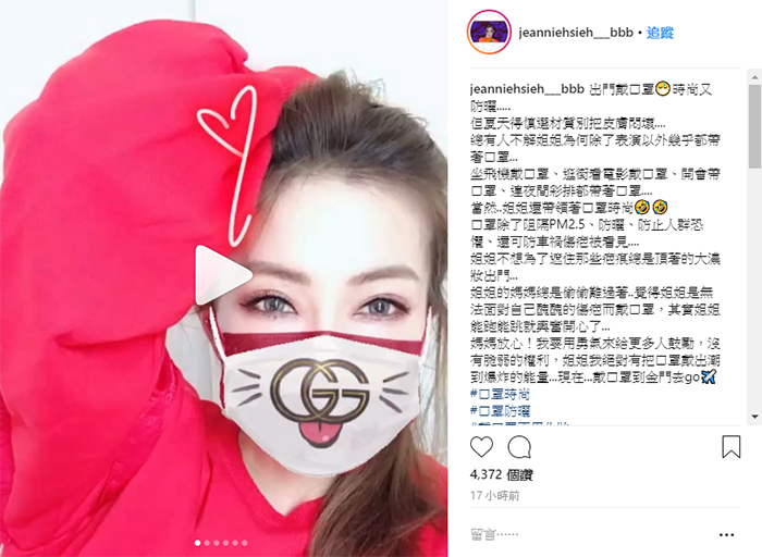 謝金燕24日透過IG發文,表示:「總有人不解姐姐為何除了表演以外幾乎都帶著口罩...」而她也坦承,一直戴著口罩,除了阻隔PM2.5、防曬、防止人群恐懼之外,就是為了要防止車禍傷疤被看見:「姐姐不想為了遮住那些疤痕總是頂著的大濃妝出門...」她更表示自己的媽媽常常為此傷心:「姐姐的媽媽總是偷偷難過著..覺得姐姐是無法面對自己醜醜的傷疤而戴口罩」,但是正能量的她認為能跑能跳就很開心了。她也安慰媽媽:「媽媽放心!我要用勇氣來給更多人鼓勵,沒有脆弱的權利,姐姐我絕對有把口罩戴出潮到爆炸的能量」孝順又正面的模樣讓人動容。