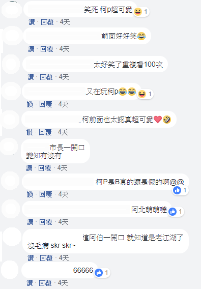 網友看到之後也紛紛留言:「笑死,柯P超可愛」、「前面好好笑」、「太好笑了重複看一百次」、「又在玩柯P」、「柯前面也太認真超可愛」、「市長一開口便知有沒有」、「阿北萌萌的」、「阿伯真的配合度好高」、「配合度太高了啦」、「 阿伯一開口就知道是老江湖了skr skr~」、「66666」。