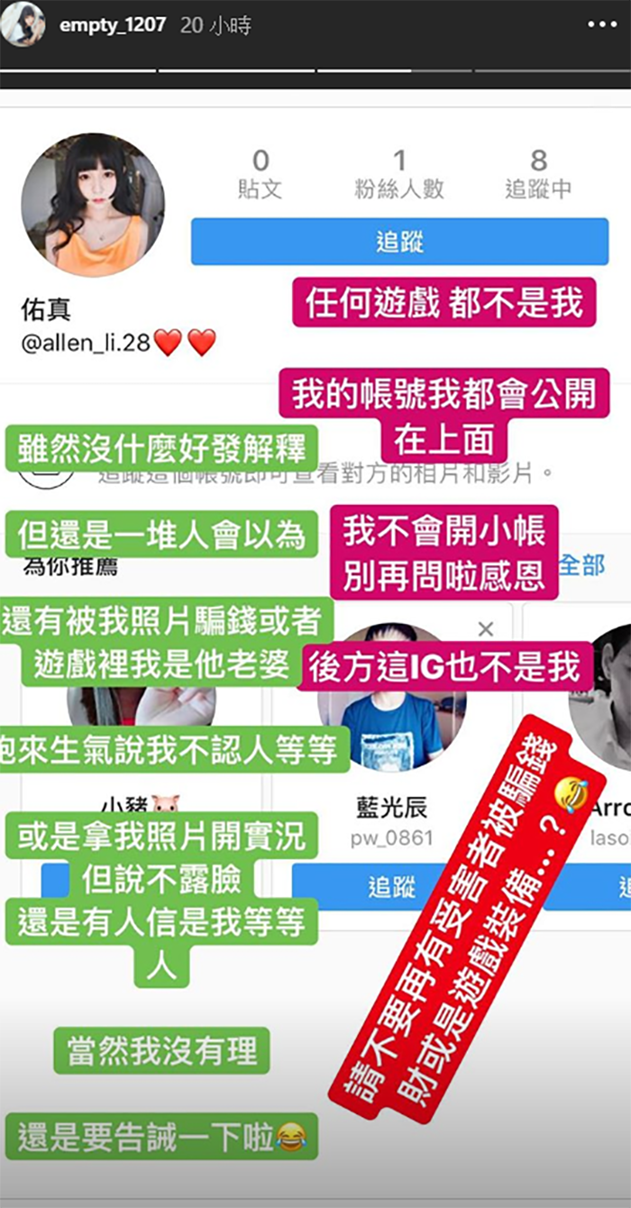 本本昨透過限時動態澄清自己沒有開小帳,她也截圖了他人盜用自己身份的頁面,只見畫面中的IG名字為「佑真」,也放上了本本的照片,如果不是她澄清,真的很像是本本的小帳!而本本也表示:「還有一堆人被我照片騙錢,或者遊戲裡我是他老婆跑來生氣說我不認人等等」、「或是拿我照片開實況,說不露臉,還是有人信是我」相當無奈表示一堆粉絲被盜用身分的有心人士欺騙,「當然我沒有理,但還是要告誡一下啦」,最後她也說:「請不要再有受害者被騙錢財或是遊戲裝備」。