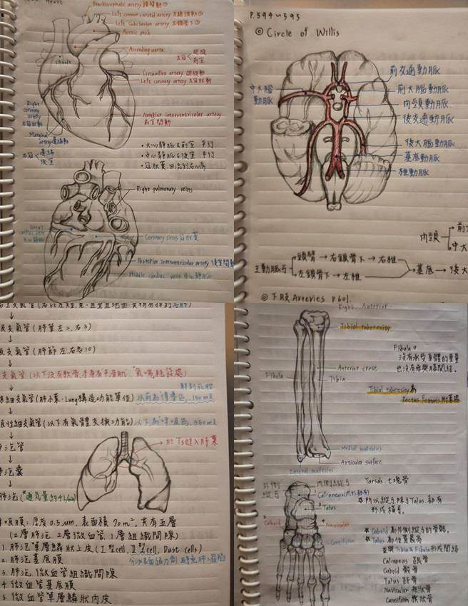 該網友女兒的筆記不但字跡工整,將循環系統及運作方式都詳記述清楚,筆記旁邊還附上精美細緻的插圖,將心臟的構造、肺部、手掌及手臂的骨骼皆描繪十分清楚,兼具藝術美感,令網友大讚女兒上課真用心,不禁大呼「畫的比解剖課本還漂亮」