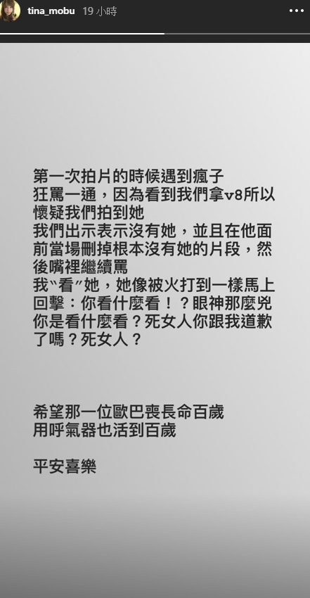 25日提提透過IG「tina_mobu」表示拍片時遇到蠻不講理的民眾。她在IG限時動態打上:「第一次拍片遇到瘋子,狂罵一通」,原來該民眾因為看到提提和Sandy拿V8拍攝,便一直懷疑自己被拍到,即便他們已經出示拍攝內容表示沒有拍攝到,並且在她面前當場刪掉「根本就沒有她的片段」,該民眾還不善罷干休,持續飆罵。