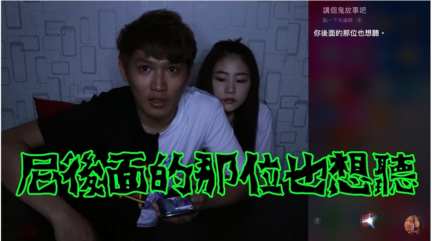 接著秀請siri講一個鬼故事來聽聽,siri回答「等等,你聽到了嗎?有人在敲門,叩叩叩」,令秀煜大起雞皮疙瘩,再問了一次siri直接回答「你後面那位也想聽」,嚇得兩人趕緊回頭查看,確認並沒有人後才稍感放心。實驗結果兩人覺得真的蠻可怕的,加上半夜的氣氛更容易讓人發毛,膽小者千萬別輕易嘗試 !