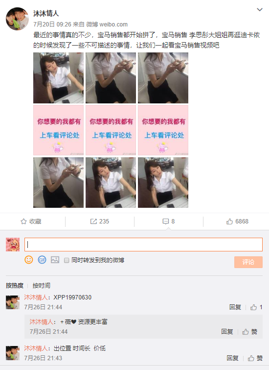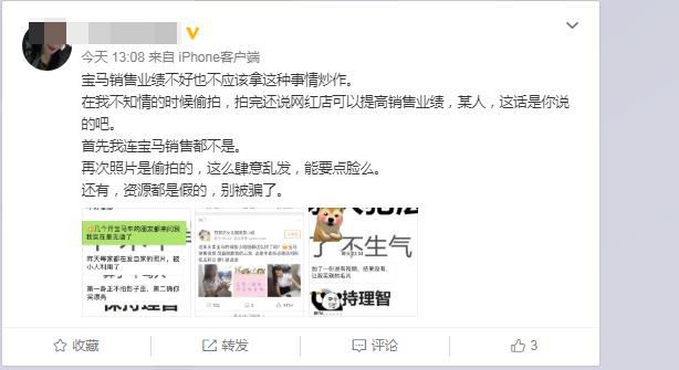 其實並沒有真正「為了衝業績,與客戶發生關係」的事件,這只是一種銷售手法,藉由兩性關係吸引大眾點擊觀看,一切都是網紅店為提高業績手法,利用正妹炒作話題,先表明自己有影片,再讓網友加微信好友,就能拿到傳說中「1分鐘」影片,而疑似女主角李思彤也出面回應了,在微博上痛批,氣憤表示根本沒有這一回事,影片更是在她不知情的時候被偷拍的,而且自己根本不是BMW的銷售業務員,全文內容「寶馬銷售業績不好也不應該拿這種事情炒作。在我不知情的時候偷拍,拍完還說網紅店可以提高銷售業績。首先我連寶馬銷售都不是。再次照片是偷拍的,肆意亂發,能要點臉嗎。」更提醒大眾:「資源都是假的,別被騙了。」