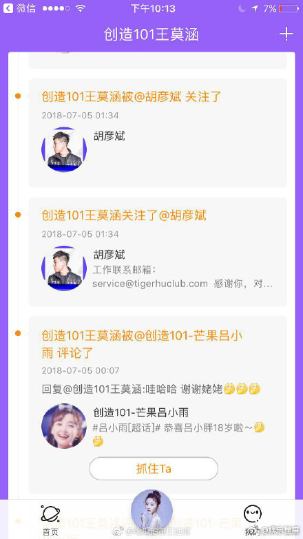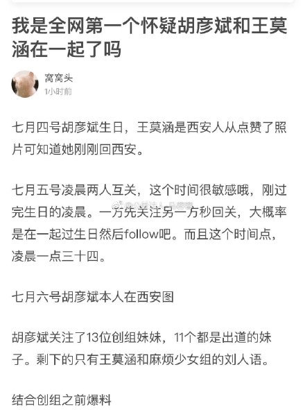 有網友發現胡彥斌的微博共關注了13位節目選手,除了11位出道者,剩下兩名就是王莫涵和劉人語。胡彥斌7/4日過35歲生日時,隔天凌晨1點34分,他和王莫涵幾乎同步關注彼此的微博,敏感時間點引發臆測,有眼尖網友還發現是西安人的王莫涵剛回家鄉,7/6日意外被樂隊發文曝光他的行蹤,地點同是在西安。